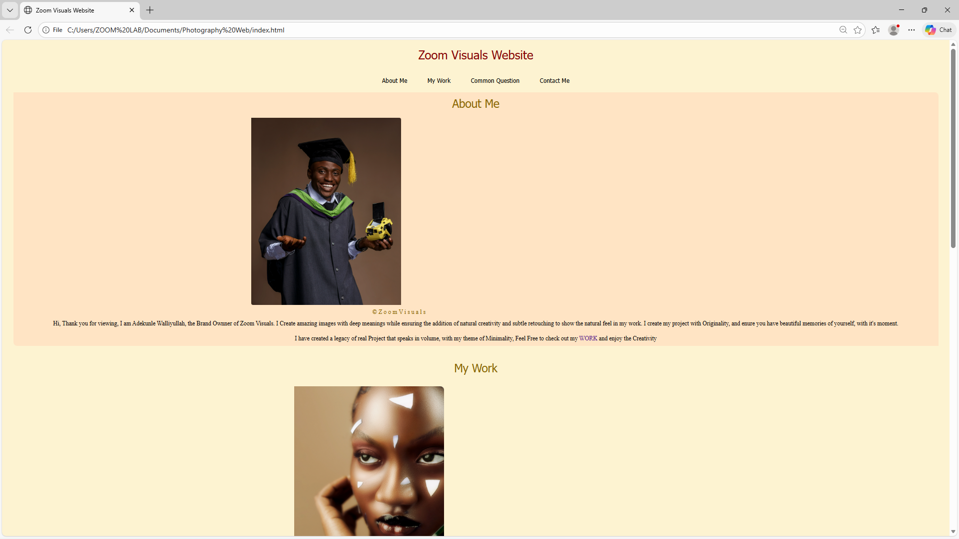 For the past few months, i have been self-learning on Html and Css and i needed to create a website for my photography project which is was led to practicing my newly learnt skills on this website. However, it is not hosted, i plan on adding more as i learn more.